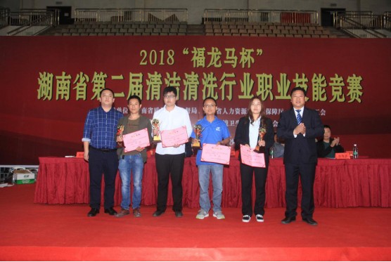 其中龙立荣获物业保洁员技能比赛第一名、段美军荣获环卫保洁员技能比赛第一名、简敦姣荣获石材护理工比赛、黄斌荣获中央空调清洗比赛第一名。湖南省职业技能竞赛组织委员会现场为获得各个工种第一名的选手授予了 “湖南省技术能手”的荣誉称号。