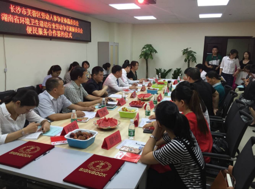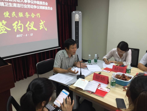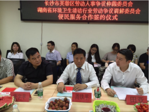 长沙市芙蓉区劳动人事争议仲裁委员会与湖南省环境卫生清洁行业劳动人事争议调解委员会签订便民服务合作协议,签订合作协议旨在以科学发展观为统领,坚持发展创新的理念,切实加强调委会组织建设、队伍建设、业务建设和工作机制建设,形成覆盖行业、适应化解突出矛盾纠纷基本需要、功能作用充分发挥、真正便民便利的行业专业人员调解工作新局面,为维护社会和谐稳定和促进行业发展作出贡献。