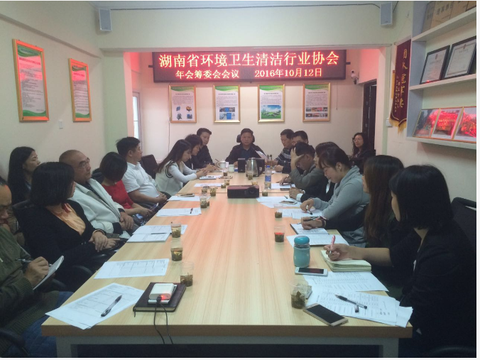 2016年10月12日下午,湖南省环境卫生清洁行业协会在协会会议室召开了常务理事单位以上会议,会上,各单位详细的汇报了年会的筹备工作,周会长认真听取汇报后,首先向各位表示问候,然后对本次会议进行了工作指导,最后对有关年会事项及宣贯标准做了重要讲话,会议由秘书长田亚主持,副会长田烈新、樊方瑞、李佑宏、副会长单位代表易艳、赵剑、姚回、谭雪花、鲁文辉以及常务理事单位代表罗靖、宋强、李雯、方晴、彭婷、刘立新、浣柱、赖美丽、何丽冰、宏祥清洁、都美物业代表等出席了会议并积极参与了讨论,会议从下午两点半持续到五点半,讨论并通过了如下内容: