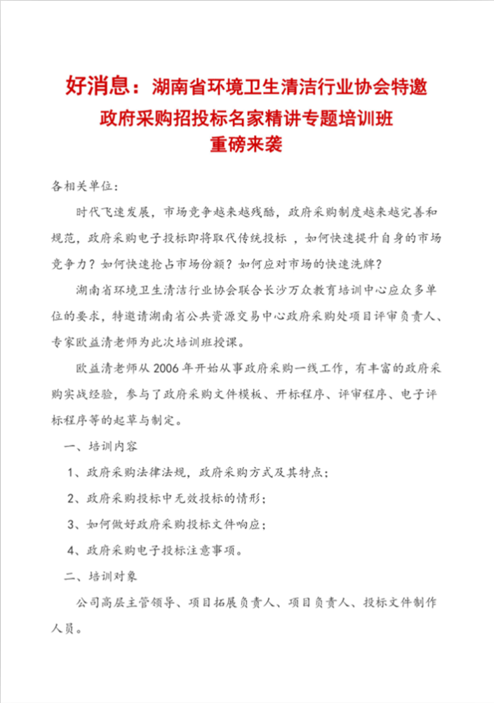 湖南省环境卫生清洁行业协会特邀 政府采购招投标名家精讲专题培训班 重磅来袭
