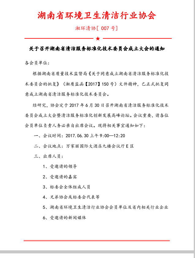 关于召开湖南省清洁服务标准化技术委员会成立大会的通知