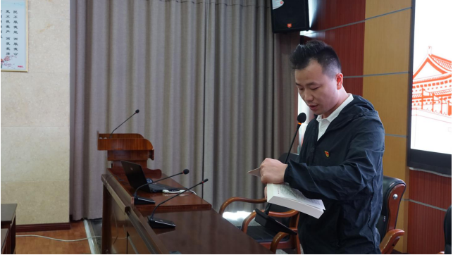 党员代表龙文就《论中国共产党历史》的重要精选章节给大家进行了宣读学习,并就个人对党史理解、对党性的觉悟、对社会应做的贡献发表了感言;