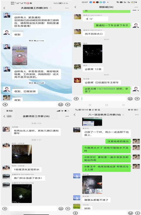 面对恶劣天气,领航城项目经理姜振辉临危不乱,马上组织工程秩序检查所有出入水口,地库,水泵房,配电房,污水井口等处。24点接到商铺电话,2栋、21栋门面全部被淹,面对紧急情况,秩序主管吴云辉,客服员陈丹工程员陈锐、杨方祥、曾宪文、王永忠,第一时间赶到门面帮商铺排水、清理。一直坚持到凌晨3点多,才帮所有商铺清理好。吴云辉,陈锐,王永忠,陈丹都是白班人员,在项目有需要时都毫无怨言自告奋勇加班,且第二天正常上班。
