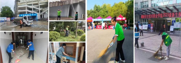 新学期前,保利天创物业的工作人员就开始对校园内草坪、绿植进行修剪;在校园内外、教学楼宇、宿舍等开展大扫除;并在迎新当天在相关区域派专人值守做好保洁工作。