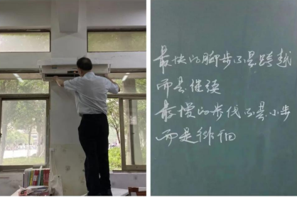 修理考研教室空调,在黑板上留下励志话语鼓励学子.