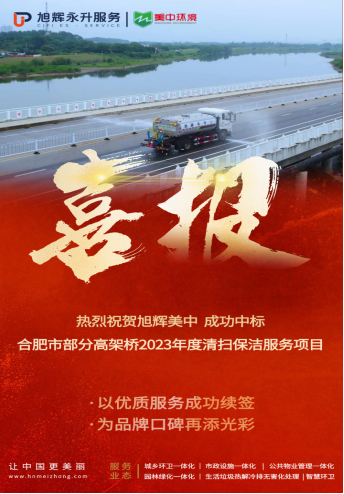 2023年9月底,旭辉美中环境再传捷报,成功中标合肥市部分高架桥2023年度清扫保洁服务项目,充分彰显了旭辉美中在城市服务领域的品牌实力!