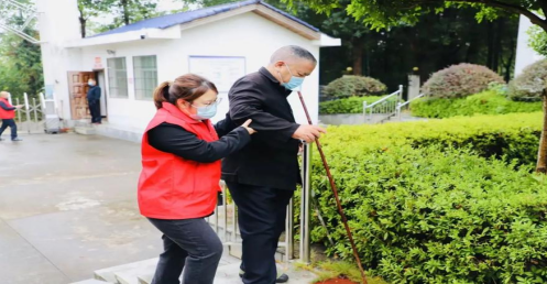 看到园区走路不便散步的老人,志愿者们主动搀扶上台阶;看到老人们的口罩没有遮住口鼻,帮助老人戴好,并按步骤耐心地教导他们下次应该怎样规范戴好口罩,以防病毒入侵。