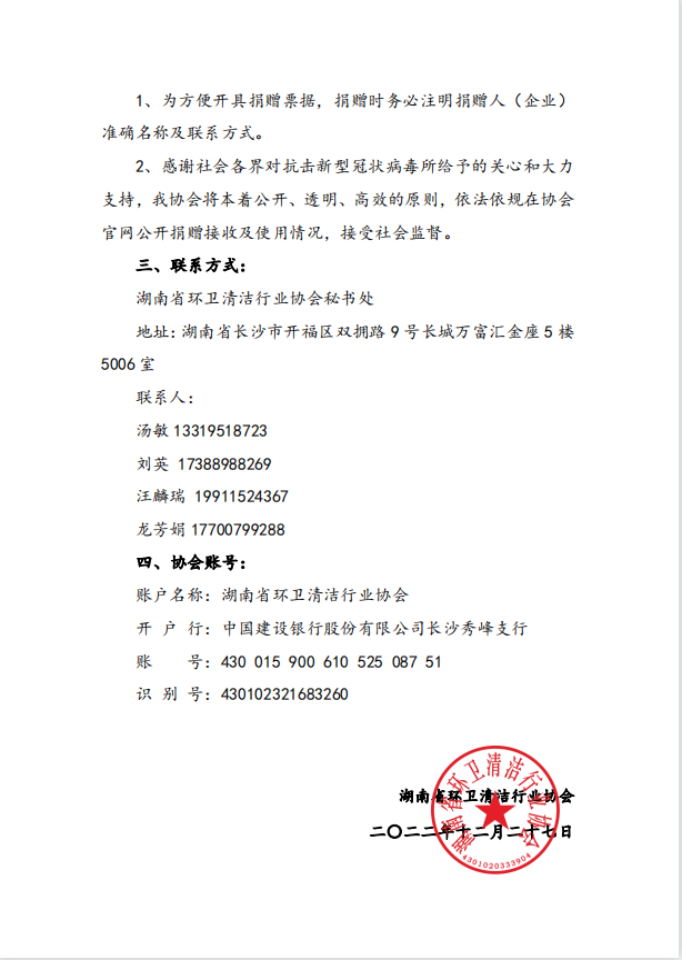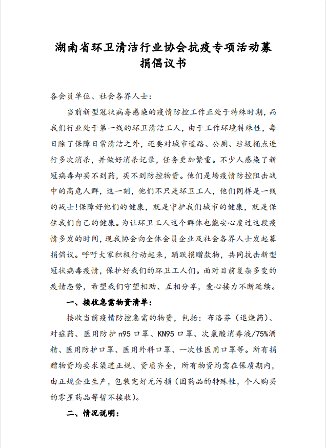 湖南省环卫清洁行业协会抗疫专项活动募捐倡议书