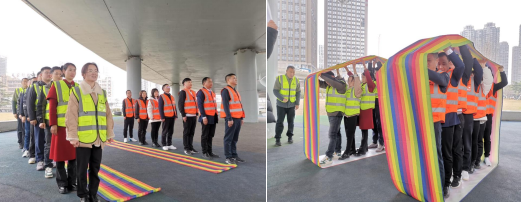 为增加团队的凝聚力、合作意识及集体荣誉感,全体学员在户外开展了“无敌风火轮”、“同心球”、“轨道运球”三个团队竞技项目。大家分成两支参赛队伍,在主持人的引导下,选出队长、口号及队名,狭路相逢勇者胜!在经过短暂的练习磨合后,各队很快找到致胜的“法宝”:“风火轮”前行时,应听从队长的口令,统一指挥协调,确保步调一致;“同心球”的牵绳队员分配好主力与辅助队员,根据球在鼓面的落点判断使用线绳的长度;“轨道运球”的诀窍是掌握好两条绳的力度与倾斜角度,使球平缓滚动完成变轨,顺利落入指定的袋中。
